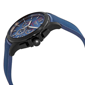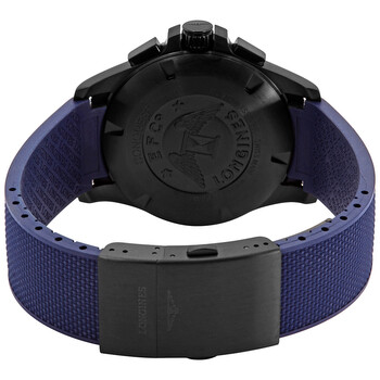 Black PVD stainless steel case with a blue rubber strap. Fixed black PVD bezel. Blue dial with luminous grey hands and index hour markers. An Arabic numeral appears at the 12 o'clock position. Minute markers around the outer rim. Dial Type: Analog. Luminescent hands and markers. Date display between the 4 and 5 o'clock positions. Chronograph - three sub-dials displaying: 60 second, 30 minute and 12 hour. Longines calibre L289.2 quartz movement. Scratch resistant sapphire crystal. Smart crown. Solid case back. Round case shape. Case size: 44 mm. Band width: 22 mm. Fold over clasp. Water resistant at 50 meters / 165 feet. Functions: perpetual calendar, date, hour, minute, second, battery eol indicator, shock resistant, magnetic resistant. Conquest V.h.p. Series. Sport watch style. Watch label: Swiss Made. Longines Conquest V.H.P. Chronograph Quartz Blue Dial Men's Watch L37272969.