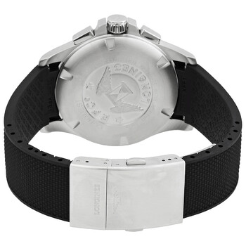 Stainless steel case with a black rubber strap. Fixed bezel. Silver dial with index-Arabic at the 12 o' clock hour markers. Minute scale around the inner rim. Dial Type: Analog. Luminescent hands and markers. Date display between 4 and 5 o'clock position. Chronograph - three sub-dials displaying: 60 second, 30 minute and 12 hours. Quartz movement. Scratch resistant sapphire crystal. Solid case back. Round case shape, case size: 44 mm. Push button folding clasp. Water resistant at 50 meters / 165 feet. Functions: chronograph, date, hour, minute, second. Conquest V.h.p. Series. Sport watch style. Watch label: Swiss Made. Longines Conquest V.H.P. Chronograph Quartz Silver Dial Men's Watch L37274769.