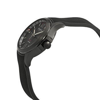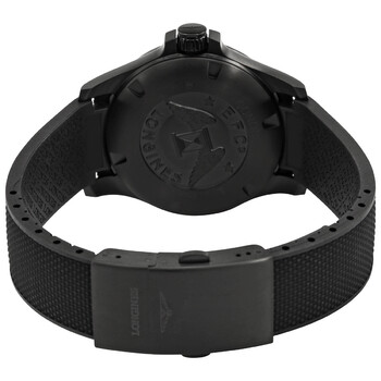 Black PVD stainless steel case with a black rubber strap. Fixed black PVD bezel. Black dial with luminous silver-tone hands and index hour markers. Arabic numerals appear at the 6 and 12 o'clock positions. Minute markers. 24 hour (GMT) markers around the outer rim. Dial Type: Analog. Luminescent hands and markers. Date display at the 3 o'clock position. Quartz movement. Scratch resistant sapphire crystal. Screw down crown. Solid case back. Round case shape. Case size: 41 mm. Case thickness: 12.5 mm. Band width: 20 mm. Fold over clasp with a push button release. Water resistant at 50 meters / 164 feet. Functions: GMT, second time zone, hour, minute, second, date. Conquest V.h.p. Gmt Series. Dress watch style. Watch label: Swiss Made. Longines Conquest V.H.P. GMT Quartz Black Dial Men's Watch L3.718.2.56.9.