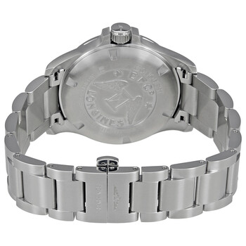 Silver-tone stainless steel case and bracelet. Fixed silver-tone stainless steel bezel. Black dial with luminous grey hands and index hour markers. Arabic numerals mark the 6 and 12 o'clock positions. Minute markers around the outer rim. Dial Type: Analog. Luminescent hands and markers. Date display at the 3 o'clock position. Longines Calibre L288 quartz movement. Scratch resistant sapphire crystal. Solid case back. Round case shape, case size: 41 mm, case thickness: 8 mm. Band width: 20 mm. Deployment with push button release clasp. Water resistant at 50 meters / 165 feet. Functions: date, hour, minute, second, eol indicator, perpetual calendar. Conquest V.h.p. Series. Dress watch style. Watch label: Swiss Made. Item Variations: L37164566. Longines Conquest V.H.P. Perpetual Black Dial Men's Watch L3.716.4.56.6.