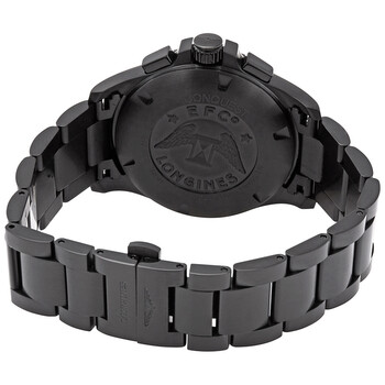 Black PVD stainless steel case and bracelet. Fixed black PVD bezel. Black carbon dial with luminous black hands and index hour markers. An Arabic numeral appears at the 12 o'clock position. Arabic numeral minute markers (at 5 minute intervals). Minute markers around the outer rim. Dial Type: Analog. Luminescent hands and markers. Date display between the 4 and 5 o'clock positions. Chronograph - three sub-dials displaying: 60 second, 30 minute and 12 hour. Longines calibre L289.2 quartz movement. Scratch resistant sapphire crystal. Pull / push crown. Solid case back. Round case shape. Case size: 42 mm. Band width: 21 mm. Triple fold over clasp with a safety release. Water resistant at 50 meters / 165 feet. Functions: chronograph, perpetual calendar, date, hour, minute, second, battery eol indicator, shock resistant, magnetic resistant. Luxury watch style. Watch label: Swiss Made. Longines Conquest V.H.P. Perpetual Chronograph Black Carbon Dial Men's Watch L37172666.