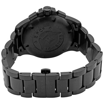 Black PVD coated stainless steel case and bracelet. Fixed black PVD coated bezel. Black dial with luminous charcoal hands and index hour markers. An Arabic numeral appears at the 12 o'clock position. Minute markers around the outer rim. Dial Type: Analog. Luminescent hands and markers. Date display between the 4 and 5 o'clock positions. Chronograph - three sub-dials displaying: 60 second, 30 minute and 12 hour. Longines calibre L289.2 quartz movement. Scratch resistant sapphire crystal. Pull / push crown. Solid case back. Round case shape. Case size: 42 mm. Band width: 21 mm. Triple fold over clasp with a safety release. Water resistant at 50 meters / 165 feet. Functions: chronograph, perpetual calendar, date, hour, minute, second, battery eol indicator, shock resistant, magnetic resistant. Luxury watch style. Watch label: Swiss Made. Longines Conquest V.H.P. Perpetual Chronograph Quartz Black Dial Men's Watch L3.717.2.56.6.