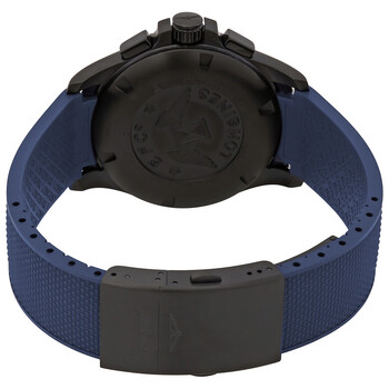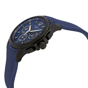 Black PVD stainless steel case with a blue rubber strap. Fixed black PVD bezel. Blue dial with luminous silver-tone hands and index hour markers. An Arabic numeral appears at the 12 o'clock position. Minute markers around the outer rim. Dial Type: Analog. Luminescent hands and markers. Date display between the 4 and 5 o'clock positions. Chronograph - three sub-dials displaying: 60 second, 30 minute and 12 hour. Longines calibre L289.2 quartz movement. Scratch resistant sapphire crystal. Pull / push crown. Solid case back. Round case shape. Case size: 42 mm. Band width: 21 mm. Triple fold over clasp with a safety release. Water resistant at 50 meters / 165 feet. Functions: chronograph, perpetual calendar, date, hour, minute, second, battery eol indicator, shock resistant, magnetic resistant. Luxury watch style. Watch label: Swiss Made. Longines Conquest V.H.P. Perpetual Chronograph Quartz Blue Dial Men's Watch L37172969.