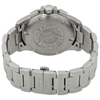 Stainless steel case with a stainless steel bracelet. Fixed stainless steel bezel. Blue dial with luminous silver-tone hands and index hour markers. An Arabic numeral appears at the 12 o'clock position. Minute markers around the outer rim. Dial Type: Analog. Luminescent hands and markers. Date display between the 4 and 5 o'clock positions. Chronograph - three sub-dials displaying: 60 second, 60 minute and 12 hour. Longines calibre L289 quartz movement. Scratch resistant sapphire crystal. Pull / push crown. Solid case back. Round case shape. Case size: 44 mm. Band width: 22 mm. Triple fold over clasp with a safety release. Water resistant at 50 meters / 165 feet. Functions: chronograph, perpetual calendar, date, hour, minute, second, battery eol indicator, shock resistant, magnetic resistant. Luxury watch style. Watch label: Swiss Made. Longines Conquest V.H.P. Perpetual Chronograph Quartz Blue Dial Men's Watch L37274966.