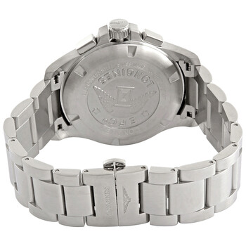 Stainless steel case with a stainless steel bracelet. Fixed stainless steel bezel. Silver dial with silver-tone hands and index hour markers. An Arabic numeral appears at the 12 o'clock position. Minute markers around the outer rim. Dial Type: Analog. Luminescent hands and markers. Date display between the 4 and 5 o'clock positions. Chronograph - three sub-dials displaying: 60 second, 30 minute and 12 hour. Longines calibre L289.2 quartz movement. Scratch resistant sapphire crystal. Pull / push crown. Solid case back. Round case shape. Case size: 42 mm. Band width: 21 mm. Triple fold over clasp with a safety release. Water resistant at 50 meters / 165 feet. Functions: chronograph, perpetual calendar, date, hour, minute, second, battery eol indicator, shock resistant, magnetic resistant. Luxury watch style. Watch label: Swiss Made. Longines Conquest V.H.P. Perpetual Chronograph Quartz Silver Dial Men's Watch L37174766.