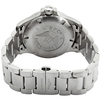 Stainless steel case with a staionless steel bracelet. Fixed stainless steel bezel. Black carbon dial with luminous silver-tone hands and index hour markers. Arabic numerals mark the 6 and 12 o'clock positions. Minute markers around the outer rim. Dial Type: Analog. Luminescent hands and markers. Date display at the 3 o'clock position. Longines calibre L288 quartz movement. Scratch resistant sapphire crystal. Pull / push crown. Solid case back. Round case shape. Case size: 43 mm. Band width: 22 mm. Triple fold over clasp with a safety release. Water resistant at 50 meters / 165 feet. Functions: perpetual calendar, date, hour, minute, second, battery eol indicator, shock resistant, magnetic resistant. Luxury watch style. Watch label: Swiss Made. Longines Conquest V.H.P. Perpetual Quartz Black Carbon Dial Men's Watch L37264666.