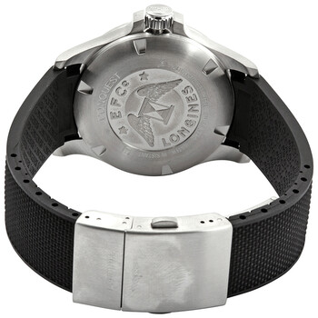 Stainless steel case with a black rubber strap. Fixed stainless steel bezel. Black dial with silver-tone hands and index hour markers. Arabic numerals mark the 6 and 12 o'clock positions. Minute markers around the outer rim. Dial Type: Analog. Luminescent hands and markers. Date display at the 3 o'clock position. Longines calibre L288 quartz movement. Scratch resistant sapphire crystal. Pull / push crown. Solid case back. Round case shape. Case size: 43 mm. Band width: 22 mm. Double fold over clasp with a safety release. Water resistant at 50 meters / 165 feet. Functions: perpetual calendar, date, hour, minute, second, battery eol indicator, shock resistant, magnetic resistant. Luxury watch style. Watch label: Swiss Made. Longines Conquest V.H.P. Perpetual Quartz Black Dial Men's Watch L37264569.