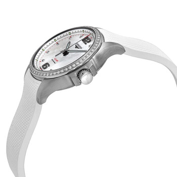Stainless steel case with a white rubber strap. Fixed stainless steel bezel set with diamonds. Mother of pearl dial with luminous black hands and diamond hour markers. Arabic numerals mark the 6 and 12 o'clock positions. Minute markers around the outer rim. Dial Type: Analog. Luminescent hands and markers. Date display at the 3 o'clock position. Longines calibre L288 quartz movement. Scratch resistant sapphire crystal. Screw down crown. Solid case back. Round case shape. Case size: 36 mm. Fold over clasp. Water resistant at 50 meters / 165 feet. Functions: date, hour, minute, second. Additional Info: case set with 56 top wesselton if-vvs diamonds (0.381 cts). Dress watch style. Watch label: Swiss Made. Longines Conquest V.H.P. Quartz Diamond Ladies Watch L3.316.0.87.9.
