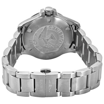 Stainless steel case with a stainless steel bracelet. Fixed black ceramic bezel. Black mother of pearl dial with luminous grey hands and Wesselton diamond hour markers. Arabic numerals appear at the 6 and 12 o'clock positions. Minute markers around the outer rim. Dial Type: Analog. Luminescent hands. Date display at the 3 o'clock position. Longines Calibre L288 quartz movement. Scratch resistant sapphire crystal. Screw down case back. Round case shape. Case size: 36 mm. Case thickness: 10.5 mm. Band width: 18 mm. Fold over clasp. Water resistant at 50 meters / 165 feet. Functions: date, hour, minute, second. Conquest V.h.p. Series. Dress watch style. Watch label: Swiss Made. Longines Conquest V.H.P. Quartz Diamond Ladies Watch L3.319.4.88.6.