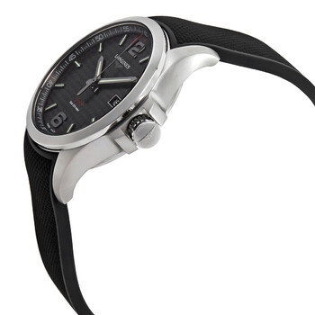 Stainless steel case with a black rubber strap. Fixed stainless steel bezel. Black carbon dial with luminous grey hands and index hour markers. An Arabic numerals mark the 6 and 12 o'clock positions. Minute markers around the outer rim. Dial Type: Analog. Luminescent hands and markers. Date display at the 3 o'clock position. Longines calibre L288 quartz movement. Scratch resistant sapphire crystal. Smart crown. Solid case back. Round case shape. Case size: 43 mm. Band width: 20 mm. Deployant clasp. Water resistant at 50 meters / 165 feet. Functions: date, hour, minute, second. Conquest V.h.p. Series. Casual watch style. Watch label: Swiss Made. Longines Conquest V.H.P. Quartz Men's Watch L37264669.