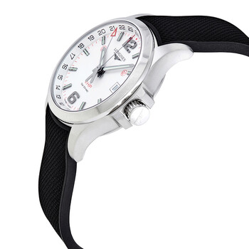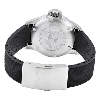 Silver-tone stainless steel case with a black rubber strap. Fixed silver-tone stainless steel bezel. Silver dial with black hands and index-Arabic numerals hour markers. 24 hours. Dial Type: Analog. Luminescent hands and markers. Date display at the 3 o'clock position. Longines Calibre L287 quartz movement. Scratch resistant sapphire crystal. Pull / push crown. Solid case back. Round case shape. Case size: 41 mm. Band width: 20 mm. Folding clasp. Water resistant at 50 meters / 165 feet. Functions: GMT, second time zone, hour, minute, second, date. Casual watch style. Watch label: Swiss Made. Longines Conquest V.H.P. Quartz Silver Dial Men's Watch L37184769.