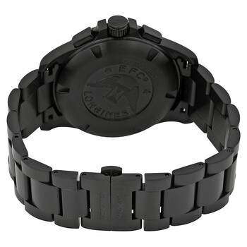 Black PVD stainless steel case and bracelet. Fixed black PVD bezel. Black carved dial with luminous black hands and index hour markers. An Arabic numeral appears at the 12 o'clock position. Minute markers around the outer rim. Dial Type: Analog. Luminescent hands and markers. Date display between the 4 and 5 o'clock positions. Chronograph - three sub-dials displaying: 60 second, 30 minute and 12 hours. Longines calibre L289 quartz movement. Scratch resistant sapphire crystal. Smart crown. Solid case back. Round case shape. Case size: 44 mm. Band width: 22 mm. Butterfly clasp. Water resistant at 50 meters / 165 feet. Functions: chronograph, date, hour, minute, second. Sport watch style. Watch label: Swiss Made. Longines Conquest V.H.P. Chronograph Black Carved Dial Men's Watch L37272566.