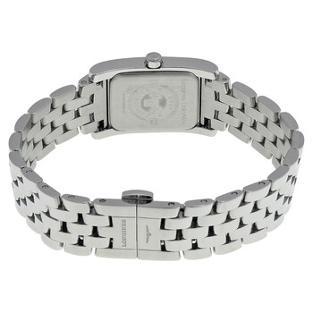 Stainless steel case with a stainless steel bracelet. Fixed stainless steel bezel. Blue mother of pearl dial with silver-toned hands and diamond hour markers. Dial Type: Analog. Small seconds sub-dial above the 6 o'clock position. Quartz movement. Scratch resistant sapphire crystal. Pull / push crown. Solid case back. Case dimensions: 24.50 mm x 20 mm. Case thickness: 7 mm. Rectangle case shape. Band width: 15 mm. Deployment clasp. Water resistant at 30 meters / 100 feet. Functions: hour, minute, second. Luxury watch style. Watch label: Swiss Made. Longines Dolce Vita Blue Mother of Pearl Dial Stainless Steel Ladies Watch L51554926.
