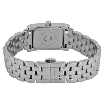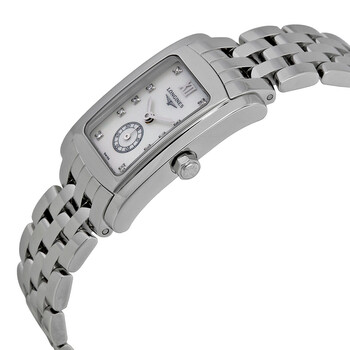 Stainless steel case with a stainless steel bracelet. Fixed stainless steel bezel. Mother of pearl dial with silver-tone hands and diamond hour markers. A Roman numeral at the 12 o'clock position. Dial Type: Analog. Small seconds. Swiss quartz movement. Scratch resistant sapphire crystal. Push / pull crown. Solid case back. Case dimensions: 24.5 mm x 19.8 mm. Case thickness: 5.5 mm. Rectangle case shape. Band width: 15 mm. Band length: 7 inches. Deployment clasp with push button. Water resistant at 30 meters / 100 feet. Functions: hour, minute. Luxury watch style. Watch label: Swiss Made. Longines Dolce Vita Diamond Mother of Pearl Ladies Watch L5.155.4.84.6.