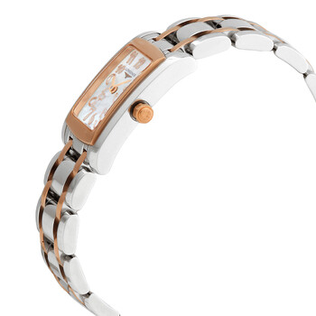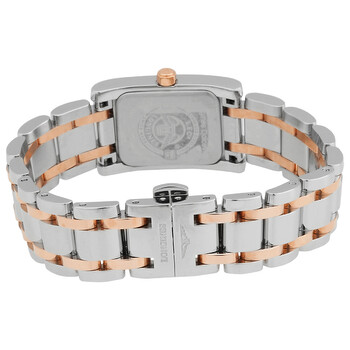 Stainless steel and 18k pink gold case with a stainless steel and 18k pink gold bracelet. Fixed bezel. Mother of pearl dial with rose gold-tone hands and Arabic numeral hour markers. Dial Type: Analog. Quartz movement. Scratch resistant sapphire crystal. Round case shape. Water resistant at 30 meters / 100 feet. Functions: hour, minute, second. Luxury watch style. Watch label: Swiss Made. Longines Dolce Vita Mother of Pearl Diamond Dial Steel and 18K Pink Gold Ladies Watch L51555977.