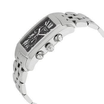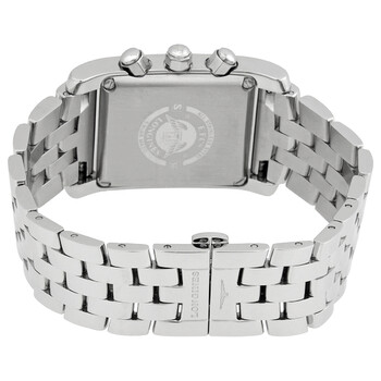 Stainless steel case with a stainless steel bracelet. Fixed stainless steel bezel. Black dial with silver-tone hands and Roman numeral hour markers. Minute markers around the outer rim. Dial Type: Analog. Date display between the 4 and 5 o'clock positions. Chronograph - three sub-dials displaying: 60 second, 30 minute and 1/10th of a second. Quartz movement. Scratch resistant sapphire crystal. Pull / push crown. Solid case back. Rectangle case shape. Case dimensions: 30 mm x 36.5 mm. Case thickness: 10.25 mm. Fold over clasp. Water resistant at 30 meters / 100 feet. Functions: date, hour, minute, second. Additional Info: original box, manual (complete accessories). Dolce Vita Series. Luxury watch style. Watch label: Swiss Made. Longines Dolce Vita Quartz Black Dial Ladies Watch L5.680.4.79.6.