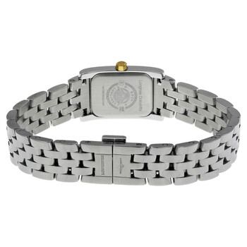 Stainless steel case with a stainless steel bracelet. Fixed silver and gold-tone bezel. Silver dial with blue hands and Roman numeral hour markers. Minute markers around the outer rim. Dial Type: Analog. Quartz movement. Scratch resistant sapphire crystal. Solid case back. Rectangle case shape. Deployment clasp. Functions: hour, minute. Luxury watch style. Watch label: Swiss Made. Longines Dolce Vita Silver Dial Stainless Steel Ladies Watch L51585706.