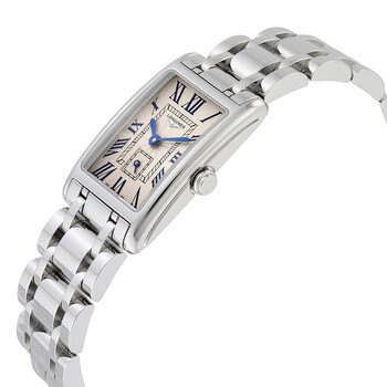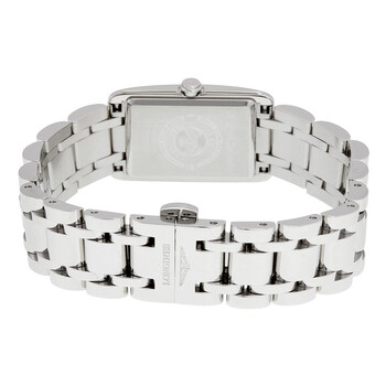 Stainless steel case with a stainless steel bracelet. Fixed stainless steel bezel. Silver dial with blue hands and Roman numeral hour markers. Minute markers around an inner ring. Dial Type: Analog. Seconds sub-dial above the 6 o'clock position. Longines calibre L178 quartz movement. Scratch resistant sapphire crystal. Pull / push crown. Solid case back. Case dimensions: 32 mm x 20.5 mm. Rectangle case shape. Band width: 15 mm. Triple fold over clasp. Water resistant at 30 meters / 100 feet. Functions: hour, minute, small second. Dress watch style. Watch label: Swiss Made. Longines Dolce Vita Silver Dial Stainless Steel Ladies Watch L52554716.