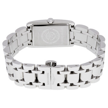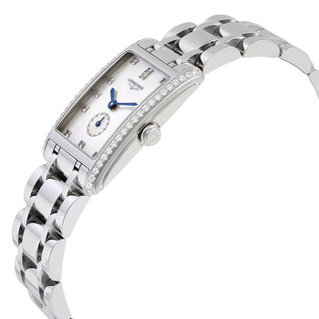 Stainless steel case with a stainless steel bracelet. Fixed stainless steel set with diamonds bezel. White mother of pearl dial with blue hands and diamond hour markers. Dial Type: Analog. Seconds sub-dial above the 6 o'clock position. Longines calibre L178 quartz movement. Scratch resistant sapphire crystal. Pull / push crown. Solid case back. Rectangle case shape. Case dimensions: 32 mm x 20.5 mm. Case thickness: 15 mm. Triple fold over clasp. Water resistant at 30 meters / 100 feet. Functions: hour, minute, small second. Dress watch style. Watch label: Swiss Made. Longines Dolce Vita White Mother of Pearl Dial Ladies Watch L52550876.