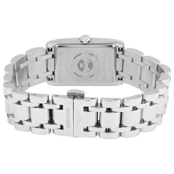 Stainless steel case with a stainless steel bracelet. Fixed stainless steel bezel. Black dial with silver-tone hands and diamond hour markers. Dial Type: Analog. Small seconds sub-dial. Longines calibre L178 quartz movement. Scratch resistant sapphire crystal. Pull / push crown. Solid case back. Rectangle case shape. Case dimensions: 20.5 mm x 32 mm. Band width: 15 mm. Fold over clasp. Water resistant at 30 meters / 100 feet. Functions: hour, minute, small second. Dolcevita Series. Dress watch style. Watch label: Swiss Made. Item Variations: L5.255.4.57.6. Longines DolceVita Diamond Ladies Watch L5.255.4.57.6.
