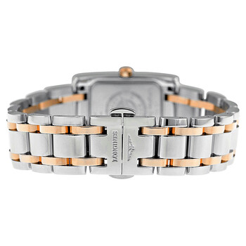 18 kt rose gold and stainless steel case with a 18 kt rose gold and stainless steel bracelet. Fixed bezel set with 32 diamonds. Silver flinque dial with blue hands and Roman numeral hour markers. Minute markers around the outer rim. Dial Type: Analog. Small seconds sub-dial at the 6 o'clock position. Quartz movement. Scratch resistant sapphire crystal. Solid case back. Case diameter: 19.8 x 24.5 mm. Rectangle case shape. Deployment clasp with push button. Water resistant at 30 meters / 100 feet. Functions: hour, minute, second. Dress watch style. Watch label: Swiss Made. Longines DolceVita Diamond Stainless Steel and Rose Gold Ladies Watch L51555797.