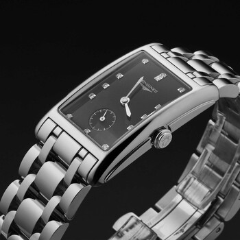 Silver-tone stainless steel case and bracelet. Fixed bezel. Black dial with silver-tone hands and diamond hour markers. Dial Type: Analog. One subdial displaying: small second. Longines Calibre L176 quartz movement. Scratch resistant sapphire crystal. Pull / push crown. Solid case back. Rectangle case shape, case size: 23 mm x 37 mm. Band width: 17 mm. Fold over clasp with a safety release. Water resistant at 30 meters / 100 feet. Functions: hour, minute, small second. Dolcevita Series. Dress watch style. Watch label: Swiss Made. Item Variations: L5.512.4.57.6. Longines Dolcevita Quartz Diamond Black Dial Ladies Watch L5.512.4.57.6.