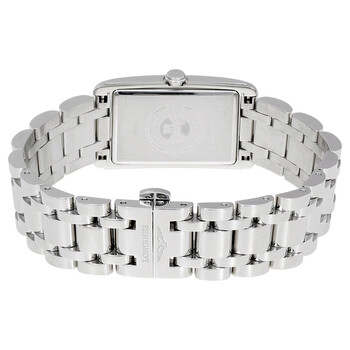 Stainless steel case with a stainless steel bracelet. Fixed stainless steel bezel set with diamonds. Silver textured dial with blue hands and Roman numeral hour markers. Minute markers around an inner ring. Dial Type: Analog. Seconds subdials. Quartz movement. Scratch resistant sapphire crystal. Solid case back. Case dimensions: 23 mm x 37 mm. Case thickness: 7.2 mm. Rectangle case shape. Band width: 17 mm. Deployment clasp with a push button release. Water resistant at 30 meters / 100 feet. Functions: hour, minute, second. Dress watch style. Watch label: Swiss Made. Longines Dolce Vita Silver Textured Dial Ladies Watch L55120716.
