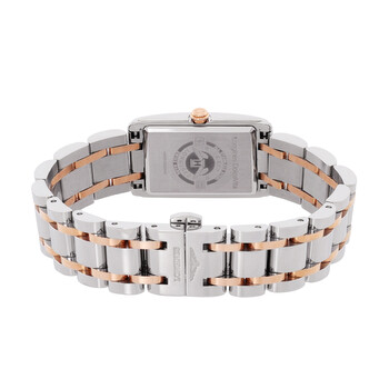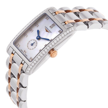 Silver-tone stainless steel case with a polished stainless steel & rose gold bracelet. Fixed silver-tone bezel. White mother of pearl dial with blue hands and diamond hour markers. Dial Type: Analog. One subdial displaying: small second. Longines Calibre L178 quartz movement. Scratch resistant sapphire crystal. Pull / push crown. Solid case back. Rectangle case shape, case size: 20.50 mm x 32.00 mm. Triple fold over clasp. Water resistant at 30 meters / 100 feet. Functions: hour, minute, small second. Dolcevita Series. Dress watch style. Watch label: Swiss Made. Longines DolceVita Quartz Diamond White Mother of Pearl Dial Ladies Watch L5.255.5.89.7.