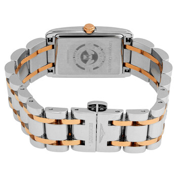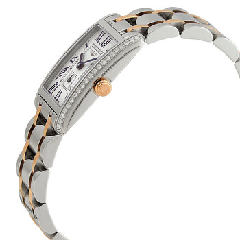 Stainless steel case with a stainless steel bracelet with rose gold links. Fixed stainless steel bezel set with diamonds. Silver-tone dial with blue hands and Roman numeral hour markers. Minute markers around an inner ring. Dial Type: Analog. Small seconds sub-dial. Longines calibre L178 quartz movement. Scratch resistant sapphire crystal. Pull / push crown. Solid case back. Rectangle case shape. Case dimensions: 20.5 mm x 32 mm. Case thickness: 6.9 mm. Band width: 15 mm. Triple fold over clasp. Water resistant at 30 meters / 100 feet. Functions: hour, minute, small second. Dolcevita Series. Dress watch style. Watch label: Swiss Made. Longines DolceVita Quartz Silver Dial Ladies Watch L5.255.5.79.7.