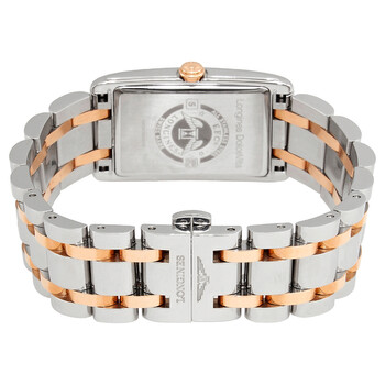 Silver-tone stainless steel case with a silver-tone stainless steel with 18kt rose gold links bracelet. Fixed silver-tone stainless steel bezel. Silver dial with blue hands and Roman numeral hour markers. Dial Type: Analog. One subdial displaying: small seconds. Longines Calibre L176 quartz movement. Scratch resistant sapphire crystal. Pull / push crown. Solid case back. Rectangle case shape, case size: 23.3 mm x 37 mm, case thickness: 7.2 mm. Band width: 17 mm. Fold over clasp with a push button release. Water resistant at 30 meters / 100 feet. Functions: hour, minute, small second. Dolcevita Series. Dress watch style. Watch label: Swiss Made. Longines DolceVita Quartz Silver Dial Ladies Watch L5.512.5.71.7.