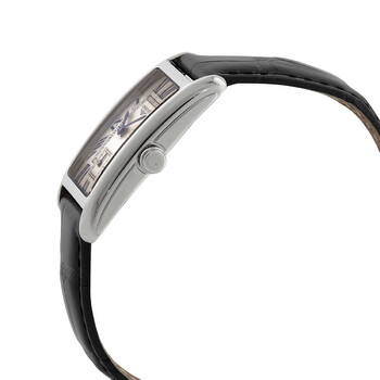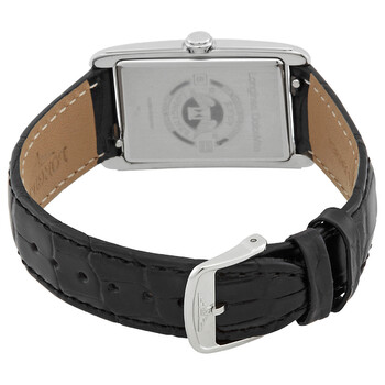Silver-tone stainless steel case with a black leather strap. Fixed silver-tone bezel. Silver dial with blue hands and Roman numeral hour markers. Dial Type: Analog. One subdial displaying: small second. Longines Calibre L176 quartz movement. Scratch resistant sapphire crystal. Pull / push crown. Solid case back. Rectangle case shape, case size: 23.00 mm x 37.00 mm. Band width: 17 mm. Water resistant at 30 meters / 100 feet. Functions: hour, minute, small second. Dolcevita Series. Dress watch style. Watch label: Swiss Made. Item Variations: L5.512.4.71.0. Longines Dolcevita Quartz Silver Dial Ladies Watch L5.512.4.71.0.
