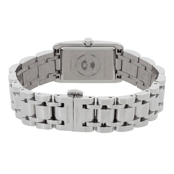 Silver-tone stainless steel case and bracelet. Fixed silver-tone stainless steel bezel. White dial with blue hands and Roman numeral hour markers. Minute scale around the inner rim. Dial Type: Analog. One subdial displaying: small second. Longines Calibre L178 quartz movement. Scratch resistant sapphire crystal. Solid case back. Rectangle case shape, case size: 20.8 x 32 mm, case thickness: 6.9 mm. Band width: 15 mm. Fold over clasp with a safety release. Water resistant at 30 meters / 100 feet. Functions: hour, minute, second. Additional Info: original box, manual (complete accessories). Dolcevita Series. Luxury watch style. Watch label: Swiss Made. Longines DolceVita Quartz White Dial Ladies Watch L5.255.4.75.6.
