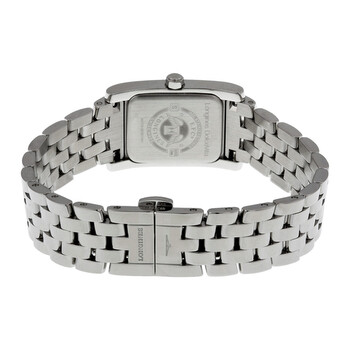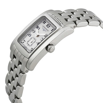 Stainless steel case with a stainless steel bracelet. Fixed stainless steel bezel. White dial with silver-tone hands and Arabic numeral hour markers. Minute markers around the outer rim. Dial Type: Analog. Small second sub-dial at the 6 o'clock position. Quartz movement. Scratch resistant sapphire crystal. Pull / push crown. Solid case back. Case diameter: 19.8 mm x 24.5 mm. Rectangle case shape. Folding clasp. Water resistant at 30 meters / 100 feet. Functions: hour, minute, small second. Luxury watch style. Watch label: Swiss Made. Longines DolceVita WHite Dial Stainless Steel Ladies Watch L51554736.