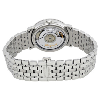 Stainless steel case with a stainless steel bracelet. Fixed stainless steel bezel. Black dial with silver-tone hands and diamond hour markers. Dial Type: Analog. Date display at the 3 o'clock position. Longines calibre L619/888 automatic movement, based upon ETA 2892, containing 21 Jewels, bitting at 25200 vph, and has a power reserve of approximately 64 hours. Scratch resistant sapphire crystal. Pull / push crown. Transparent case back. Round case shape. Case size: 34.50 mm. Case thickness: 6 mm. Band width: 19 mm. Fold over clasp with a push button release. Water resistant at 30 meters / 100 feet. Functions: date, hour, minute, second. Additional Info: 13 wesselton vs diamonds (0.032 carats). Elegant Series. Luxury watch style. Watch label: Swiss Made. Longines Elegant Automatic Black Dial Midsize Watch L48094576.