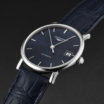 Silver-tone stainless steel case with a blue leather strap. Fixed silver-tone stainless steel bezel. Blue dial with silver-tone hands and index hour markers. Dial Type: Analog. Date display at the 3 o'clock position. Automatic movement. Scratch resistant sapphire crystal. Round case shape, case size: 34 mm. Functions: date, hour, minute, second. Additional Info: original box, international warranty card, manual (complete accessories). Elegant Series. Luxury watch style. Watch label: Swiss Made. Longines Elegant Automatic Blue Dial Ladies Watch L48094922.