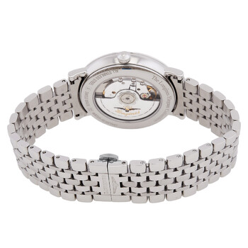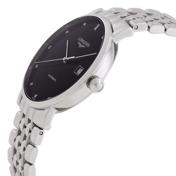 Silver-tone stainless steel case with a silver-tone stainless steel bracelet. Fixed silver-tone stainless steel bezel. Black dial with silver-tone hands and diamond hour markers. Dial Type: Analog. Date display at the 3 o'clock position. Longines Calibre L619 automatic movement with a 42-hour power reserve. Scratch resistant sapphire crystal. Pull / push crown. Round case shape, case size: 39 mm, case thickness: 8.5 mm. Band width: 20 mm. Water resistant at 30 meters / 100 feet. Functions: date, hour, minute, second. Dress watch style. Watch label: Swiss Made. Longines Elegant Automatic Diamond Black Dial Men's Watch L4.910.4.57.6.
