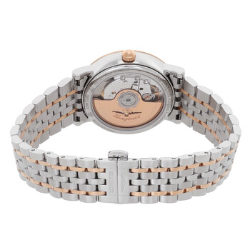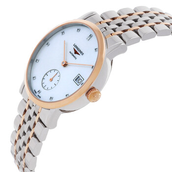 Silver-tone stainless steel case with a two-tone (silver-tone and rose gold-tone) stainless steel bracelet. Fixed rose gold-tone 18kt rose gold bezel. White dial with rose gold-tone hands and diamond hour markers. Dial Type: Analog. Date display at the 3 o'clock position. Longines Calibre L891 automatic movement. Scratch resistant sapphire crystal. Transparent see through case back. Round case shape, case size: 34 mm. Deployment with push button release clasp. Water resistant at 30 meters / 100 feet. Functions: date, hour, minute, second. Additional Info: original box, international warranty card, manual (complete accessories). Elegant Series. Luxury watch style. Watch label: Swiss Made. Longines Elegant Automatic Diamond White Dial Ladies Watch L4.312.5.87.7.