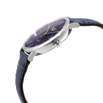 Silver-tone stainless steel case with a blue alligator leather strap. Fixed bezel. Sunray blue dial with polished silver-tone hands and index hour markers. Dial Type: Analog. Date display at the 3 o'clock position. Longines Calibre L888 Automatic movement, based upon ETA A31.L11, containing 21 Jewels, bitting at 25200 vph, and has a power reserve of approximately 64 hours. Scratch resistant sapphire crystal. Pull / push crown. Transparent see through case back. Round case shape, case size: 37 mm. Buckle clasp. Water resistant at 30 meters / 100 feet. Functions: date, hour, minute, second. Elegant Series. Watch label: Swiss Made. Longines Elegant Automatic Ladies Watch L4.810.4.92.2.