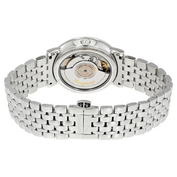 Stainless steel case with a stainless steel bracelet. Fixed stainless steel bezel. White dial with black hands and Roman numeral hour markers. Minute markers around the outer rim. Dial Type: Analog. Date display at the 3 o'clock position. Longines calibre L619/888 automatic movement, based upon ETA 2892, containing 21 Jewels, bitting at 25200 vph, and has a power reserve of approximately 64 hours. Scratch resistant sapphire crystal. Pull / push crown. Transparent case back. Round case shape. Case size: 34.50 mm. Case thickness: 6 mm. Band width: 20 mm. Fold over clasp with a push button release. Water resistant at 30 meters / 100 feet. Functions: date, hour, minute, second. Elegant Series. Luxury watch style. Watch label: Swiss Made. Longines Elegant Automatic White Dial Ladies Steel Watch L4.809.4.11.6.