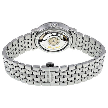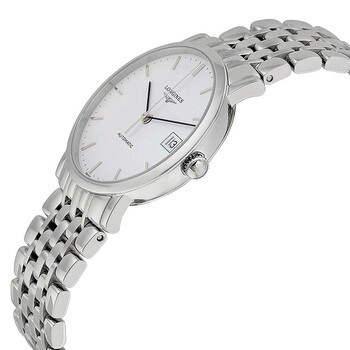 Stainless steel case with a stainless steel bracelet. Fixed stainless steel bezel. White dial with silver-tone hands and index hour markers. Minute markers around the outer rim. Dial Type: Analog. Date display at the 3 o'clock position. Longines calibre L619 automatic movement with a 42-hour power reserve. Scratch resistant sapphire crystal. Pull / push crown. Transparent case back. Case diameter: 34.5 mm. Case thickness: 6 mm. Round case shape. Bracelet width: 19 mm. Hidden fold over clasp. Water resistant at 30 meters / 100 feet. Functions: date, hour, minute, second. Dress watch style. Watch label: Swiss Made. Longines Elegant Automatic White Dial Stainless Steel Automatic Ladies Watch L48094126.