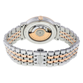 Stainless steel case with a stainless steel bracelet with 18kt rose gold links. Fixed 18kt rose gold bezel. White dial with black hands and Roman numeral hour markers. Minute markers around the outer rim. Dial Type: Analog. Date display at the 3 o'clock position. Longines calibre L619/888 automatic movement with a 42-hour power reserve. Scratch resistant sapphire crystal. Pull / push crown. Transparent case back. Round case shape. Case size: 39 mm. Case thickness: 8.5 mm. Band width: 20 mm. Deployment clasp. Water resistant at 30 meters / 100 feet. Functions: date, hour, minute, second. Luxury watch style. Watch label: Swiss Made. Longines Elegant Automatic White Dial Men's Watch L4.910.5.11.7.