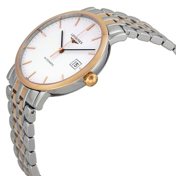 Stainless steel case with a two-tone (silver and rose gold-plated) stainless s bracelet. Fixed rose gold-plated bezel. White dial with black hands and index hour markers. Minute markers around the outer rim. Dial Type: Analog. Date display at the 3 o'clock position. Longines Calibre L619 automatic movement with about 42 hours of power reserve. Scratch resistant sapphire crystal. Pull / push crown. Skeleton case back. Case size: 37 mm. Round case shape. Triple fold over with push button release clasp. Water resistant at 30 meters / 100 feet. Functions: date, hour, minute, second. Dress watch style. Watch label: Swiss. Item Variations: L4 810 5 12 7, L4-810-5-12-7, L4/810/5/12/7, L48105127. Longines Elegant Automatic White Dial Two-tone Steel Watch L4.810.5.12.7.