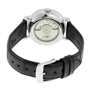 Stainless steel case with a black alligator leather strap. Fixed stainless steel bezel. Black dial with silver-tone hands and diamond hour markers. Dial Type: Analog. Date display at the 3 o'clock position. Longines calibre L595/L592 automatic movement with a 40-hour power reserve. Scratch resistant sapphire crystal. Pull / push crown. Skeleton case back. Case size: 29 mm. Round case shape. Band width: 14 mm. Tang clasp. Water resistant at 30 meters / 100 feet. Functions: date, hour, minute, second. Dress watch style. Watch label: Swiss Made. Item Variations: L43104572. Longines Elegant Black Diamond Dial Automatic Ladies Watch L4.310.4.57.2.