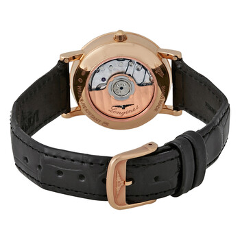 18 carat rose gold case with a black alligator leather strap. Fixed-diamond set bezel. Silver dial with black hands and Roman numeral hour markers. Dial Type: Analog. Date display at the 3 o'clock position. Longines Calibre 595/592 automatic movement with about 40 hours of power reserve. Scratch resistant sapphire crystal. Skeleton transparent exhibition see through case back. Case size: 27 mm. Round case shape. Band width: 14 mm. Water resistant at 30 meters / 100 feet. Functions: date, hour, minute, second. Additional Info: case set with 56 diamonds (0381 carats). Luxury watch style. Watch label: Swiss Made. Longines Elegant Collection Automatic 18K Rose Gold Ladies Watch L43789110.
