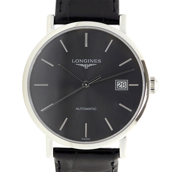 Silver-tone stainless steel case with a black leather strap. Fixed silver-tone stainless steel bezel. Grey dial with silver-tone hands and index hour markers. Dial Type: Analog. Date display at the 3 o'clock position. Longines Calibre L619 Automatic movement, based upon ETA 2892-A2, containing 21 Jewels, bitting at 28800 vph, and has a power reserve of approximately 42 hours. Scratch resistant sapphire crystal. Pull / push crown. Transparent case back. Round case shape, case size: 37 mm. Buckle clasp. Water resistant at 30 meters / 100 feet. Functions: date, hour, minute, second. Additional Info: original box, international warranty card, manual (complete accessories). Elegant Series. Luxury watch style. Watch label: Swiss Made. Longines Elegant Grey Dial Men's Watch L4.810.4.72.2.