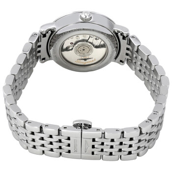 Silver-tone stainless steel case with a silver-tone stainless steel bracelet. Fixed silver-tone bezel with diamond set. Mother of pearl dial with silver-tone hands and diamond hour markers. Dial Type: Analog. Date display at the 3 o'clock position. Longines Calibre L595/592 Automatic movement, based upon ETA 2000-1, containing 20 Jewels, bitting at 28800 vph, and has a power reserve of approximately 40 hours. Scratch resistant sapphire crystal. Pull / push crown. Transparent case back. Round case shape, case size: 29 mm, case thickness: 9 mm. Band width: 14 mm. Deployment clasp. Water resistant at 30 meters / 100 feet. Functions: date, hour, minute, second. Elegant Series. Luxury watch style. Watch label: Swiss Made. Longines Elegant Mother of Pearl Dial Ladies Watch L43100876.