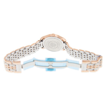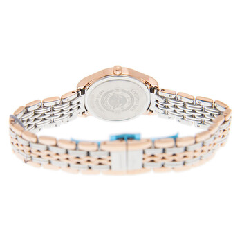 Rose gold-tone stainless steel case with a two-tone (silver-tone and rose gold-tone) stainless steel bracelet. Fixed rose gold-tone stainless steel bezel. White dial with rose gold-tone hands and Roman numeral hour markers. Minute markers around the outer rim. Dial Type: Analog. Date display at the 3 o'clock position. Quartz movement. Scratch resistant sapphire crystal. Solid case back. Round case shape, case size: 25 mm. Fold over clasp with a safety release. Functions: date, hour, minute, second. Additional Info: original box, manual (complete accessories). Elegant Series. Luxury watch style. Watch label: Swiss Made. Longines Elegant Quartz White Dial Ladies Watch L4.259.1.11.7.
