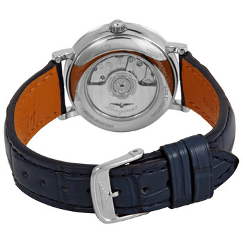Stainless steel case with a blue (alligator) leather strap. Fixed stainless steel bezel. Sunray blue dial with silver-tone hands and index hour markers. Dial Type: Analog. Date display at the 3 o'clock position. Longines calibre L592 automatic movement, based upon ETA A20.L01, containing 22 Jewels, bitting at 28800 vph, and has a power reserve of approximately 40 hours. Scratch resistant sapphire crystal. Pull / push crown. Transparent case back. Round case shape. Case size: 29 mm. Case thickness: 8.5 mm. Band width: 14 mm. Tang clasp. Water resistant at 30 meters / 100 feet. Functions: date, hour, minute, second. Elegant Series. Dress watch style. Watch label: Swiss Made. Longines Elegant Sunray Automatic Blue Dial Ladies Watch L4.310.4.92.2.