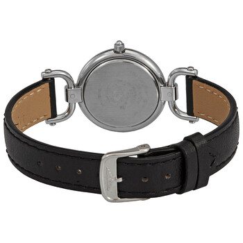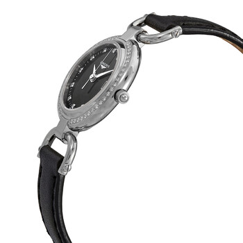 Stainless steel case with a black leather strap. Fixed stainless steel bezel set with diamonds. Black dial with silver-tone hands and diamond hour markers. Minute markers around the outer rim. Dial Type: Analog. Date display at the 3 o'clock position. Longines calibre L152 quartz movement. Scratch resistant sapphire crystal. Pull / push crown. Solid case back. Round case shape. Case size: 26.5 mm. Case thickness: 12 mm. Band width: 12 mm. Tang clasp. Water resistant at 30 meters / 100 feet. Functions: date, hour, minute, second. Equestrian Series. Dress watch style. Watch label: Swiss Made. Longines Equestrian Quartz Diamond Black Dial Ladies Watch L6.130.0.57.0.