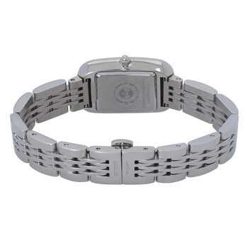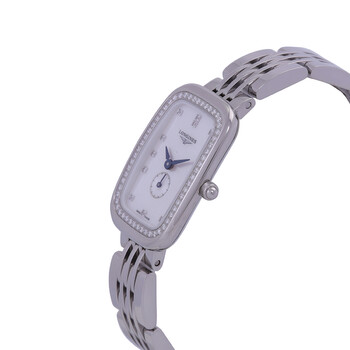 Silver-tone stainless steel case and bracelet. Fixed silver-tone bezel with diamond set stainless steel. Mother of pearl dial with blue hands and diamond hour markers. Dial Type: Analog. Longines Caliber L178 quartz movement. Scratch resistant sapphire crystal. Pull / push crown. Solid case back. Rectangle case shape, case size: 22 mm, case thickness: 6.2 mm. Band width: 12 mm, band length: 7 inches. Deployment with push button release clasp. Water resistant at 30 meters / 100 feet. Functions: hour, minute, second. Additional Info: hours, minutes, small seconds, battery eol indicator. Equestrian Series. Luxury watch style. Watch label: Swiss Made. Longines Equestrian Quartz Diamond Ladies Watch L6.141.0.87.6.